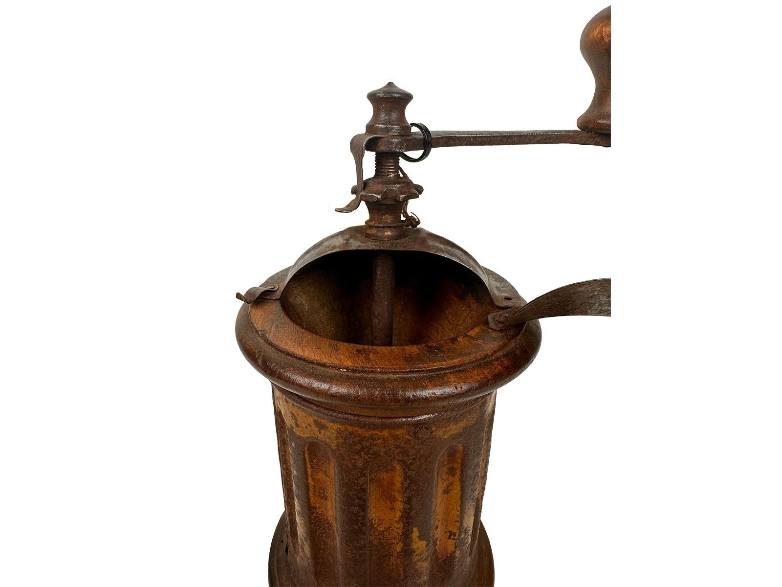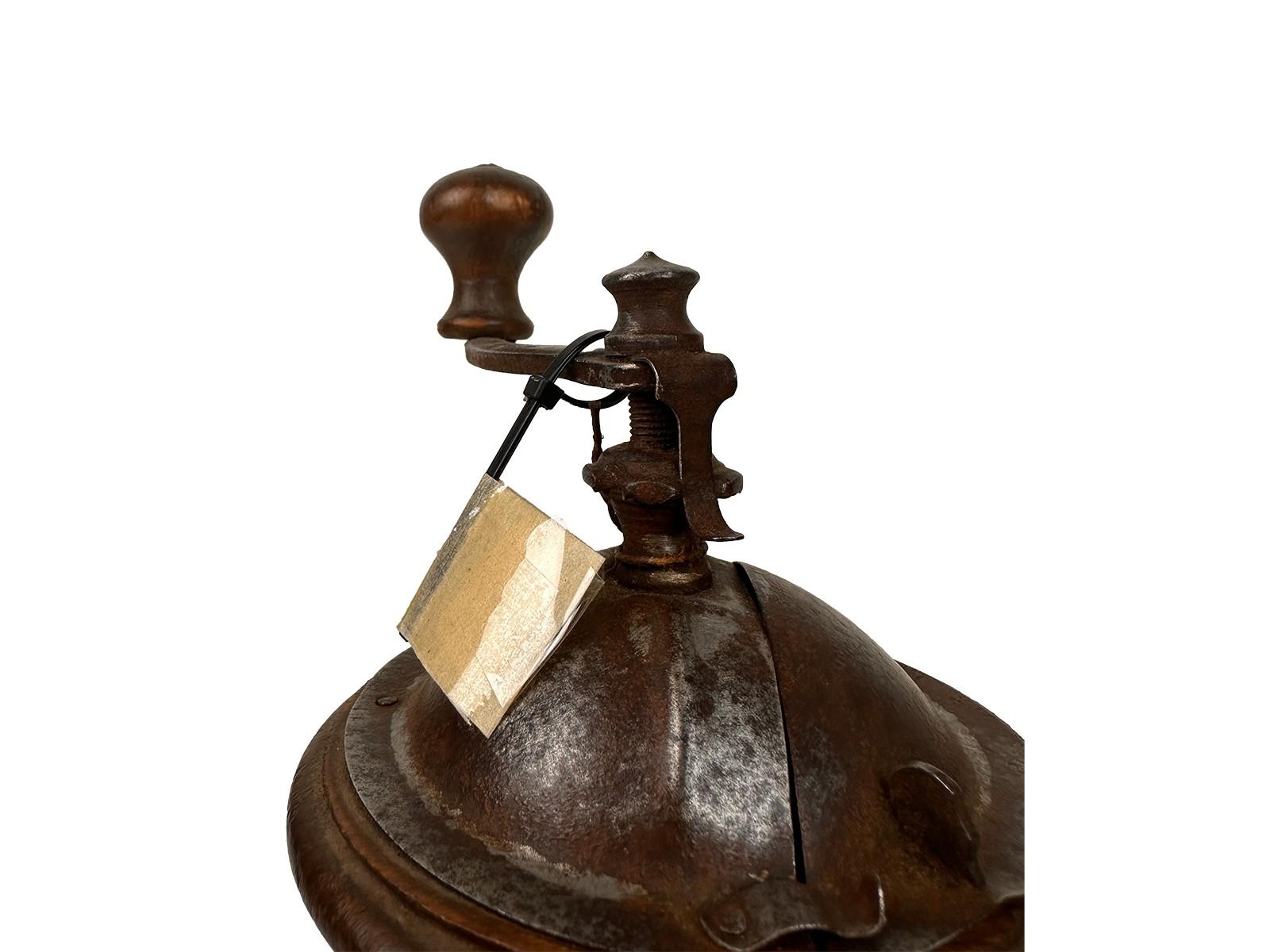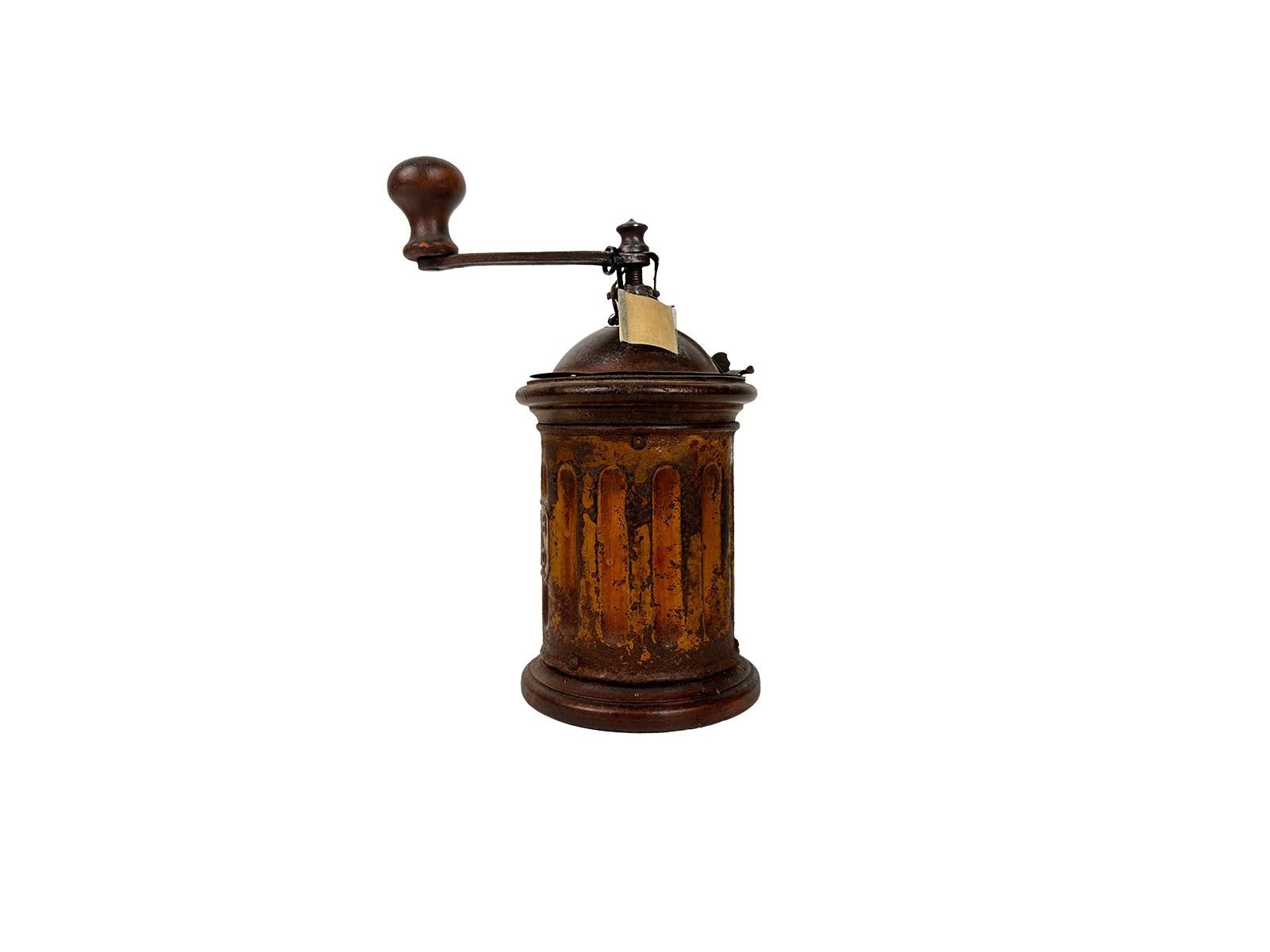 e la struttura interamente in ferro. Un oggetto che evoca immediatamente l'atmosfera delle cucine di inizio Novecento. Caratteristiche e Autenticità: Il macinino conserva tutta la sua anima vintage grazie alla patina originale del ferro, che ne testimonia l'uso e l'età. La struttura tonda, meno comune dei classici modelli a cassetta in legno, lo rende un pezzo particolarmente ambito dai collezionisti e un complemento d'arredo perfetto per cucine rustiche o ambienti in stile industrial.