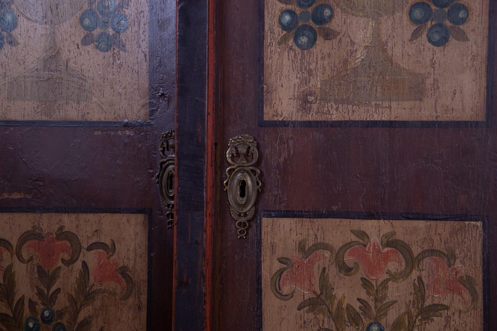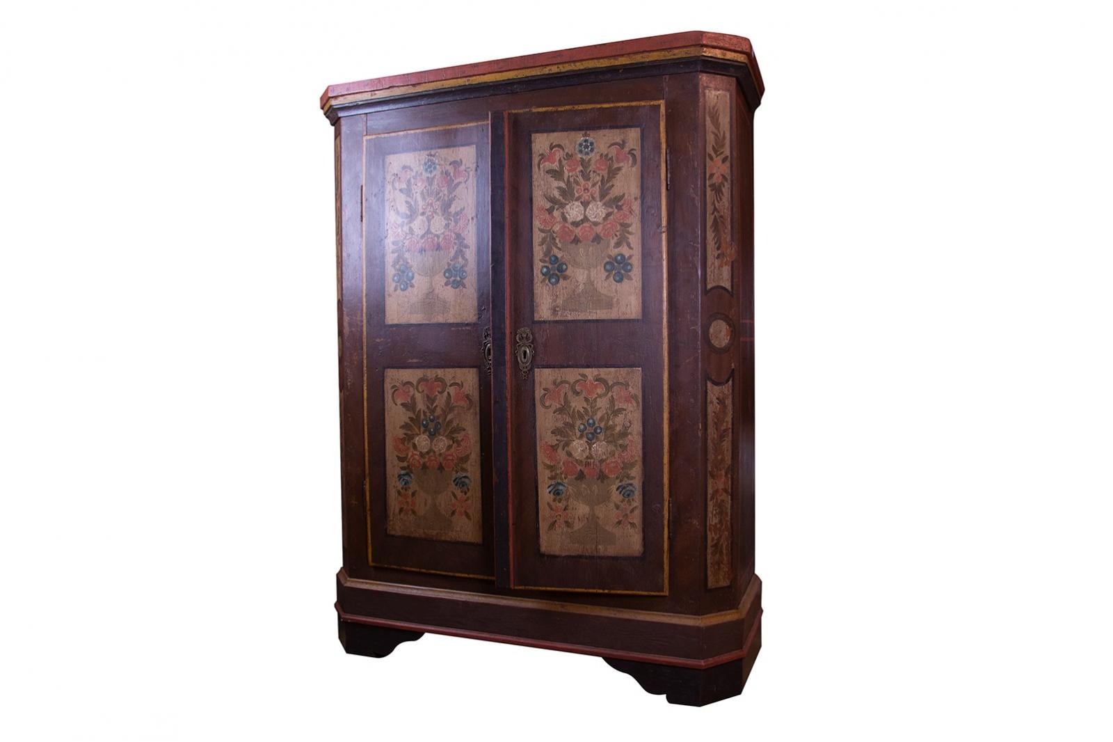 arredamento tradizionale alpino. La struttura si distingue per le linee solide e la cimasa modanata, ma il vero cuore di questo mobile risiede nelle sue splendide decorazioni pittoriche. Un capolavoro di arte povera: I quattro pannelli frontali delle ante e i fianchi del mobile sono arricchiti da delicati dipinti eseguiti a mano. Le decorazioni raffigurano vasi di fiori e composizioni floreali classiche, incorniciate da profili che creano un contrasto cromatico caldo e accogliente sulla base scura del mobile