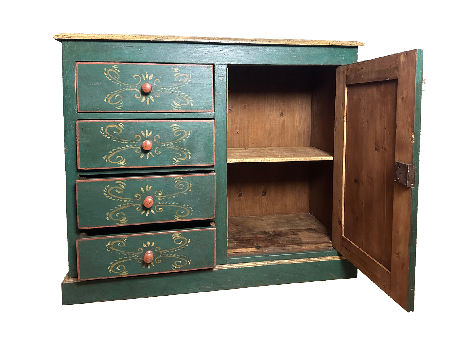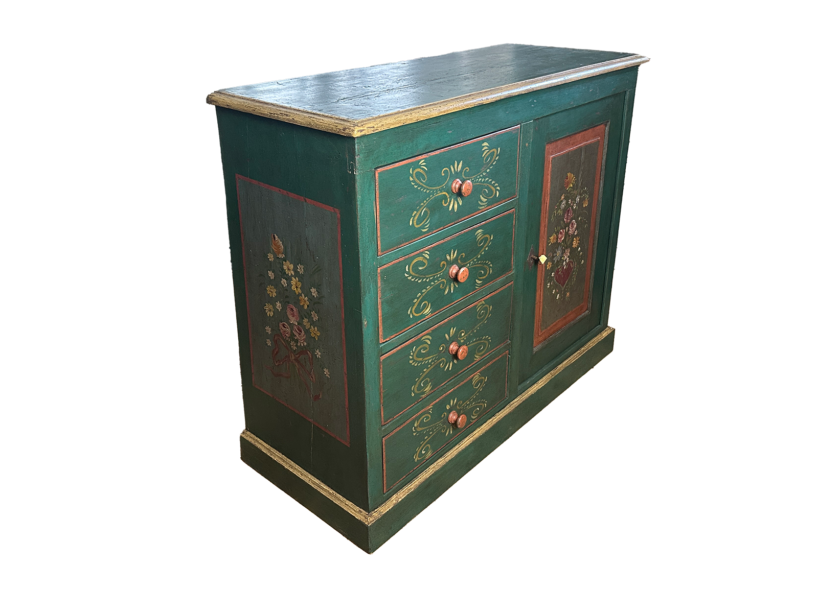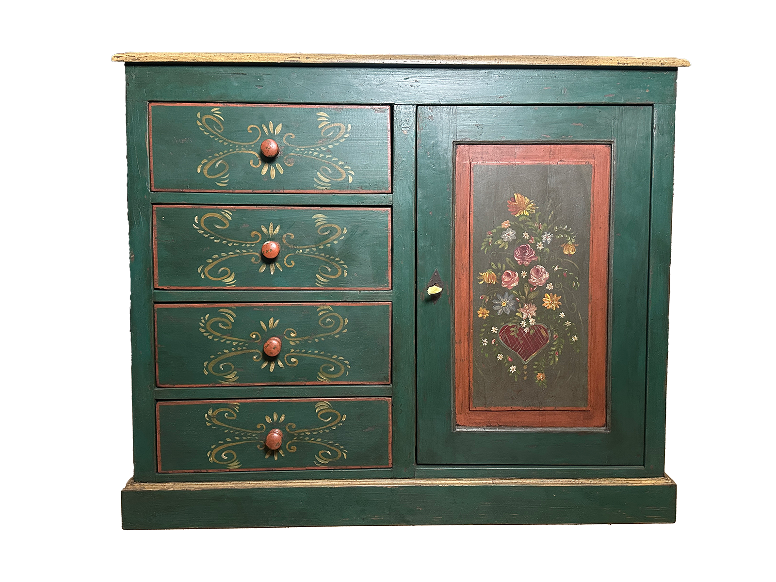 dipinta a mano con motivi floreali tradizionali che celebrano l'arte povera d'alta quota. Il fronte è diviso in modo asimmetrico e funzionale: sul lato sinistro troviamo quattro ampi cassetti decorati con volute color ocra, mentre sul lato destro un'anta a pannello incornicia un raffinato bouquet di fiori e un cuore centrale, simbolo iconico del folklore tirolese. La patina del tempo e le piccole imperfezioni del legno di abete conferiscono a questo mobile un'anima autentica, rendendolo perfetto per chi desidera un pezzo unico capace di scaldare l'atmosfera di qualsiasi ambiente. Ideale come mobile d'ingresso, dispensa per la cucina o elemento decorativo per una camera da letto dallo stile romantico.
